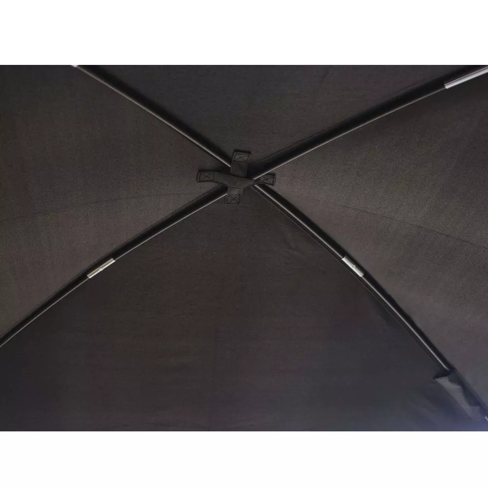 Mit gerade einmal 5,1 kg Gesamtgewicht ist es nicht nur extrem leicht, es lässt sich zudem auch sehr schnell aufbauen. Zwei Glasfiberstäbe die überkreuz laufen geben dem Dach eine gute Spannung und sorgen für eine angenehme Höhe. Die zwei vorderen Aufstellstangen aus robustem CarbonX lassen sich teleskopieren und sorgen für den nötigen Stand.