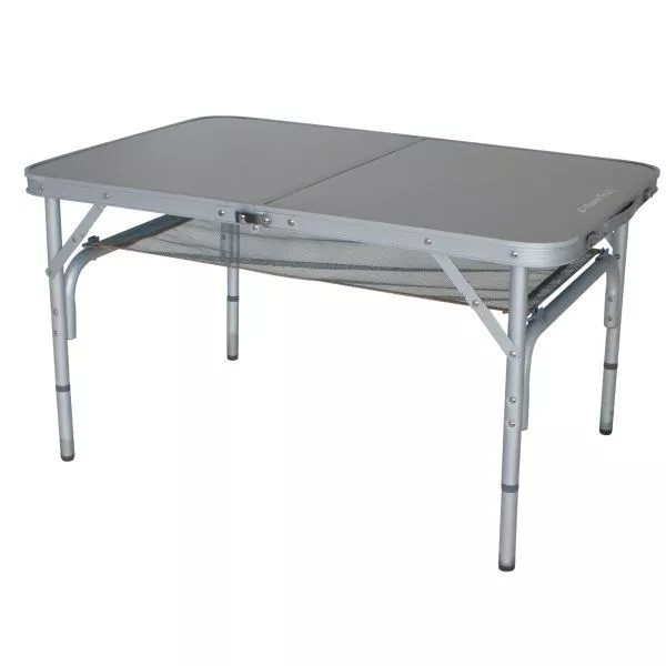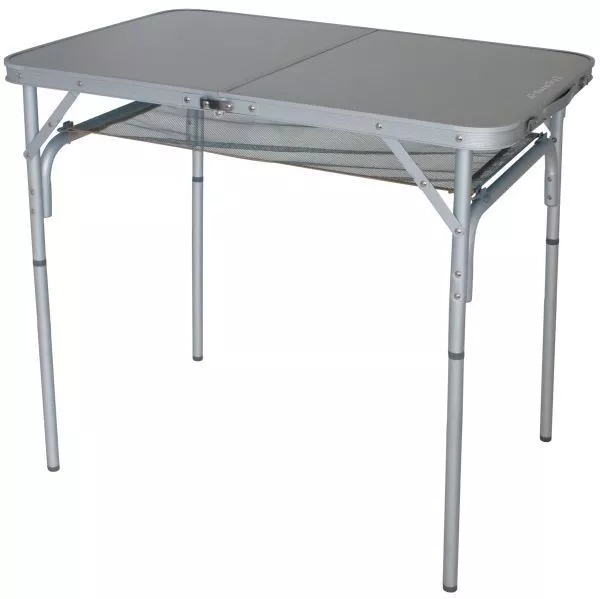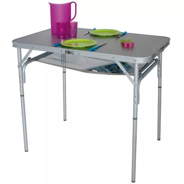 Der Campingtisch Eurotrail Monnai besteht aus einem stabilen Aluminium-Rahmen mit rutschfesten Füssen. Der Tisch ist zusammenklappbar und wird mit einer Reisetasche geliefert. Die Tischoberfläche ist wasserdicht und hitzebeständig. Mit Nylon-Mesh Zusatzablage unter der Tischplatte zum Ablegen von Kleinigkeiten, wie z.B. Zeitung. Der Tisch lässt sich in zwei Höhen aufstellen und kann so auch als separater Kindertisch genutzt werden.