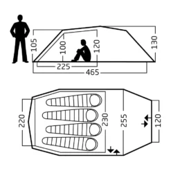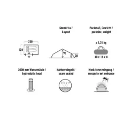 Überzelt: 15D reissfestes Nylon mit DuraShield, Polyurethan und Silikon mit Wassersäule: 1.200 mm