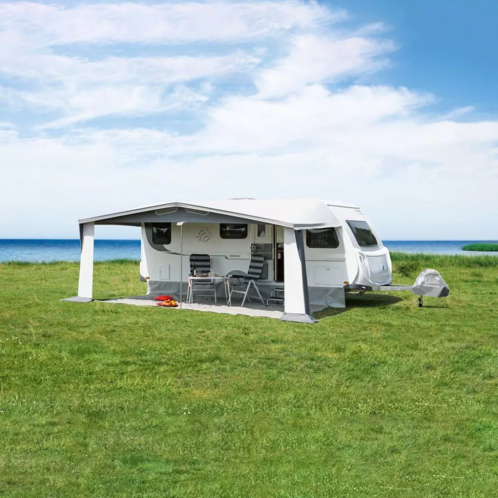 Das Frankana Freiko Lux kann sowohl als geschlossenes Vorzelt, als auch als offenes Sonnendach genutzt werden. Die Vorder- und Seitenwände sind komplett herausnehmbar. Die Vorderwand kann geteilt und als Veranda abgeklappt werden. Auch eine hochrollbare Eingangstür ist enthalten. Für noch mehr Gemütlichkeit und wohnliche Atmosphäre sind passende Gardinen im Lieferumfang mit dabei.